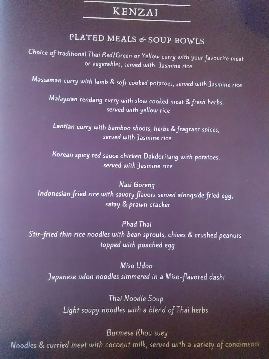 When it comes to plated meals & soup bowls, Kenzai excels with offerings like the Massaman Curry with Lamb, perfectly paired with fluffy jasmine rice. The Malaysian Laksa is another standout, brimming with balanced spices that create a comforting embrace on a cool day. It's a culinary journey across Asia that engages all the senses, but it’s essential to note that the menu could benefit from clearer vegetarian designations to help diners navigate the options better.